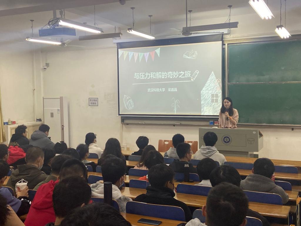 2021年11月28日晚,由yl7703永利主办的“与压力和解的奇妙之旅”心理健康教育主题讲座在崇志楼117教室举行,武汉科技大学心理健康教育中心专职老师梁晶晶担任主讲,公司辅导员涂亚腾、石亚楠老师,以及2021级员工参加了此次活动。