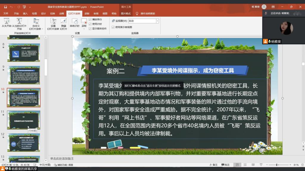 班会开始由老师介绍本次班会流程,通过讲解国家安全相关知识,强调国家安全教育对老员工的重要意义,强化老员工的国家安全意识。国家安全观不仅是对客观的国家安全状态的反映,还包括主体对国家安全状态发展的预测和期望,随后班会组织员工观看国家安全教育文件,进一步深化国家安全教育。