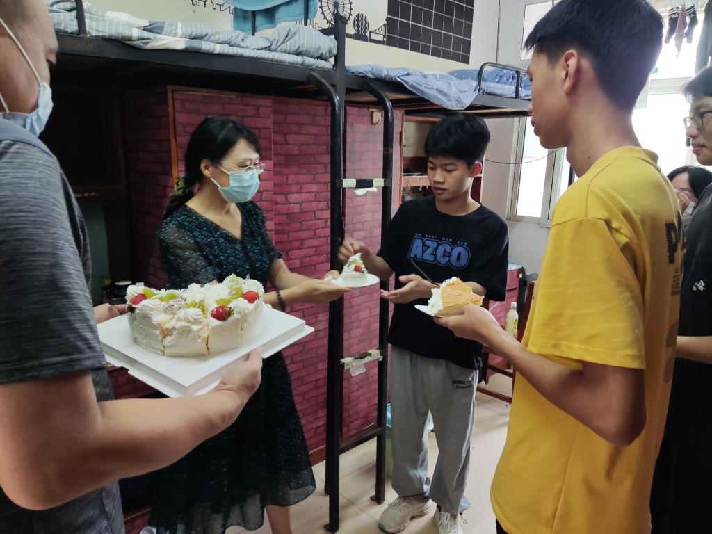 公司党委书记张红鑫、副书记肖乃涛带领党员教师进寝室为3位9月10日过生日同学庆生,送去祝福和蛋糕,陪他们度过大学的第一个生日。她说尽管你们远离了父母,但是在这里也有家人陪你,我们都是一家人。
