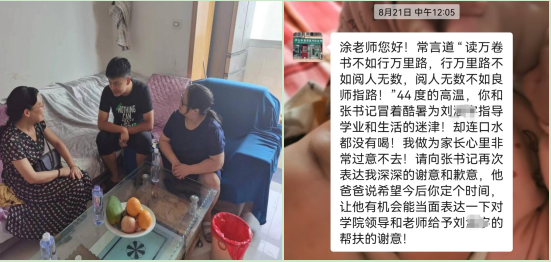 8月15日,20级辅导员石亚楠专程赶到黄陂区走访了通信12101班小熊同学,小熊同学是单亲家庭,平时习惯了自我封闭,不太喜欢和同学交流,此次家访,母亲很感动,谈及了很多平时没有老师们没有发现的问题,也讲了很多孩子和家庭的成长故事,让石老师也感触颇深。她说:“这一趟家访,让我改变了对一个孩子的看法,改变了对一个家庭的认识,更是改变了我对教育的认知。不家访,你永远也无法了解藏在员工性情成绩背后的原因,无法给员工真正的教育,无法打通通往孩子心底的那一公里,永远不懂立德树人真正的含义。”