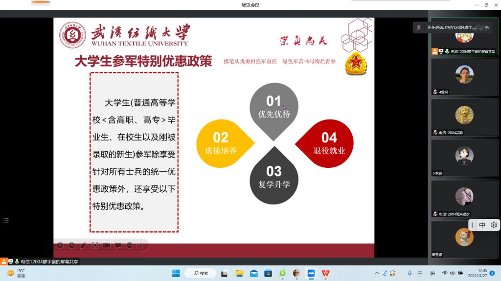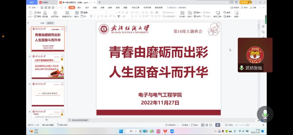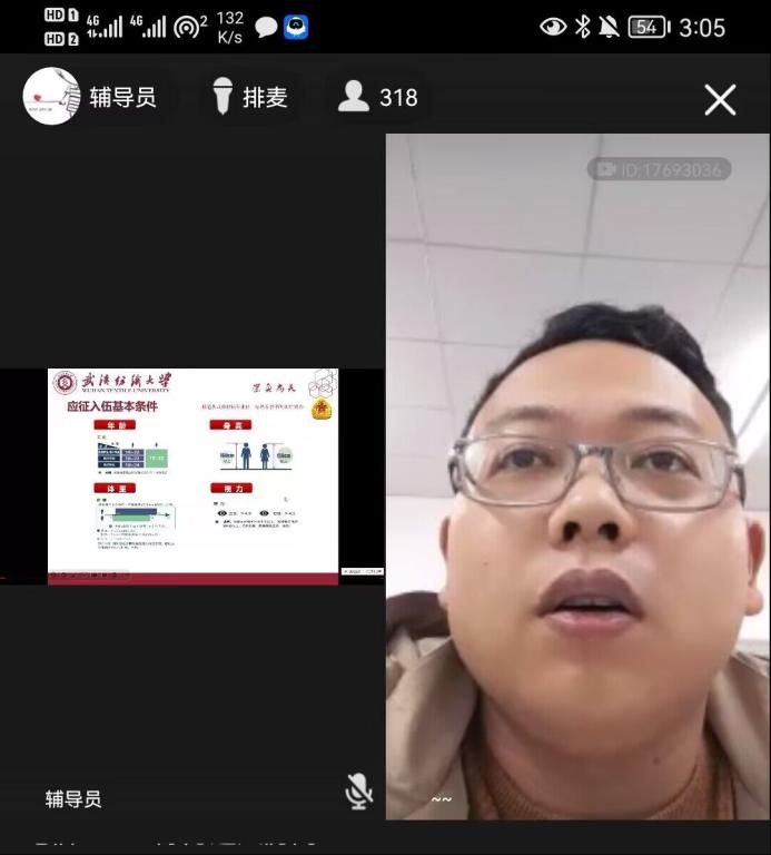 2021级辅导员任强老师从老员工入伍应征条件、应征流程、优待政策、发展途径以及经济补助等方面做了详细说明,并介绍了电气12104班汤恒同学参军入伍的精彩经历,鼓励同学们携笔从戎,报效祖国。