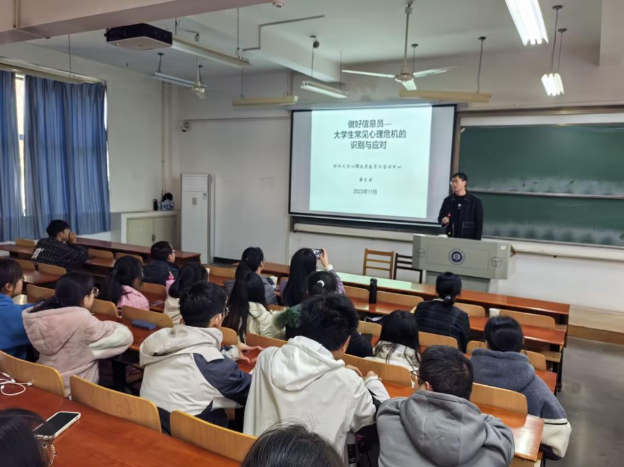 接着,黄老师从胡鑫宇事件导入,分别介绍了抑郁症的典型症状及其相关表现。接着从病理知识、伦理、法律、生命价值以及实践检验等方面强调及时识别并报告心理危机的重要性。随后,黄老师详细介绍了学业困难、家庭关系重大变故、学业困难、就业困难等心理危机事件的诱因,并从案例分析的角度讲述了如何进行心理危机事件的应对,鼓励同学们主动寻求帮助,当他人遇到心理危机时,也可以通过主动关心、倾听他们的情绪宣泄、耐心陪伴、给予希望等帮助他们走出危机。