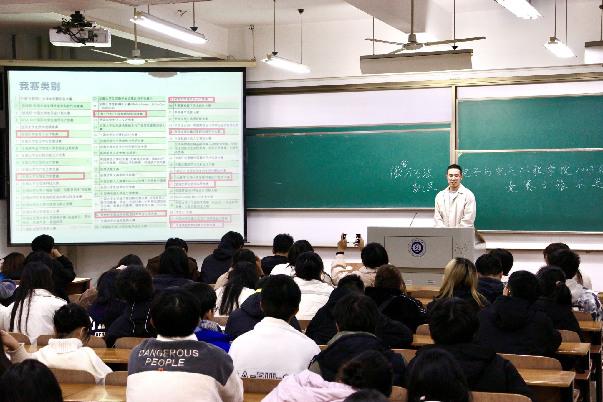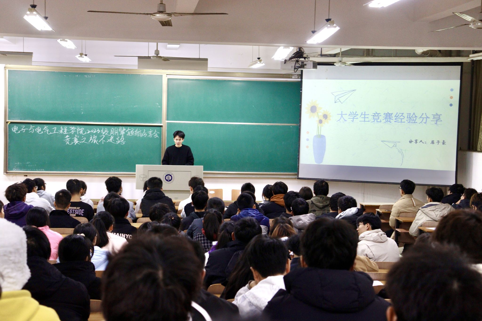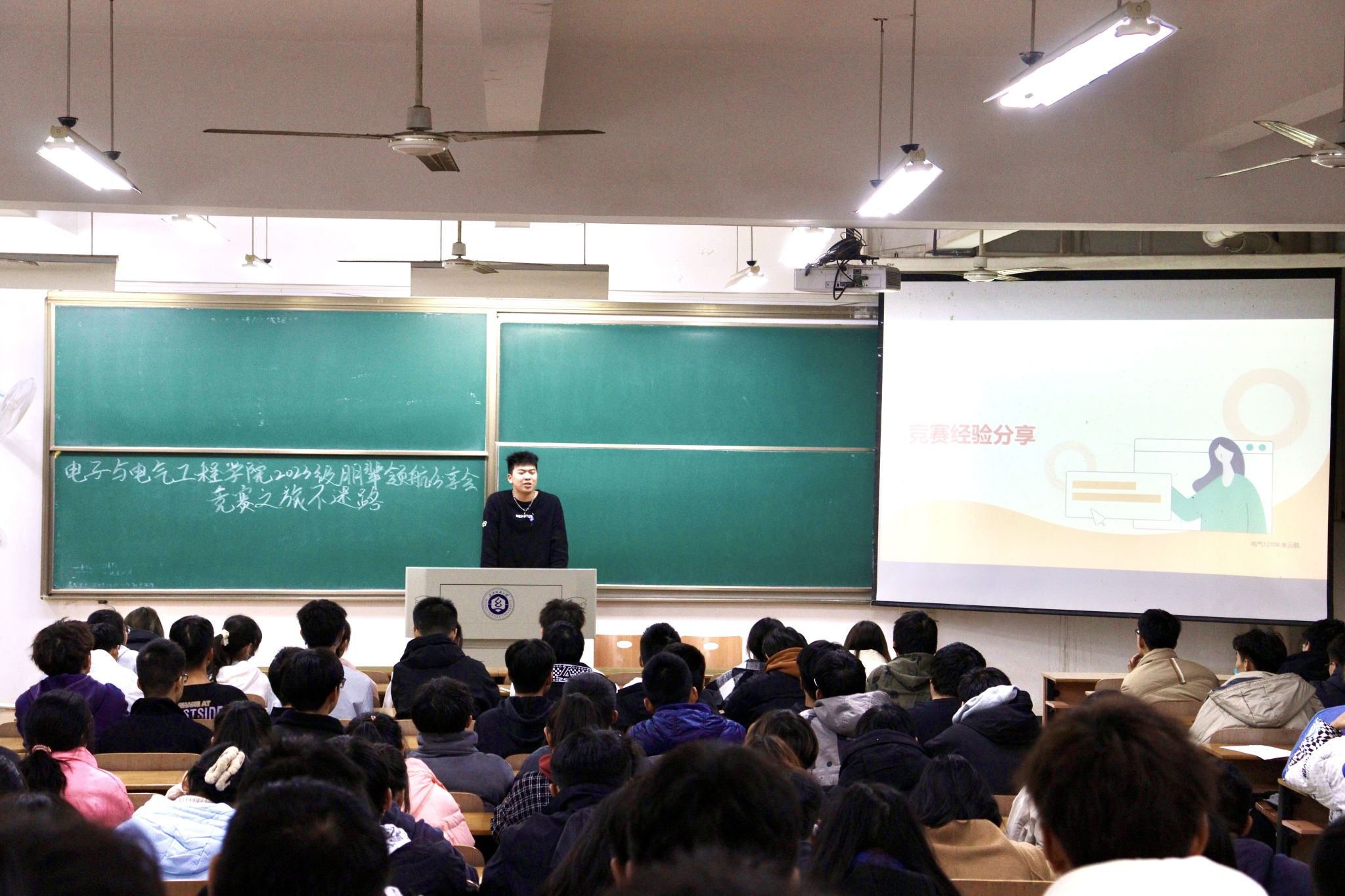 为助力新生更全面、深入地了解学科竞赛相关情况,进一步培养员工创新思维和创新意识,不断加强学风建设,发挥优秀青年员工朋辈影响力和号召力,11月26日晚上,yl7703永利在阳光校区六号教学楼111教室和113教室开展了“竞赛之旅不迷路”朋辈领航分享会活动。本次分享会由电气12104朱云航、电气12104班屈子豪、电信12103严业畅、通信12101班梅寒4名同学担任主讲人,2023级辅导员陈珍老师及全体2023级员工参加本次活动。