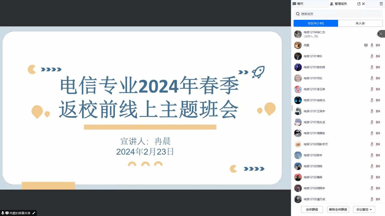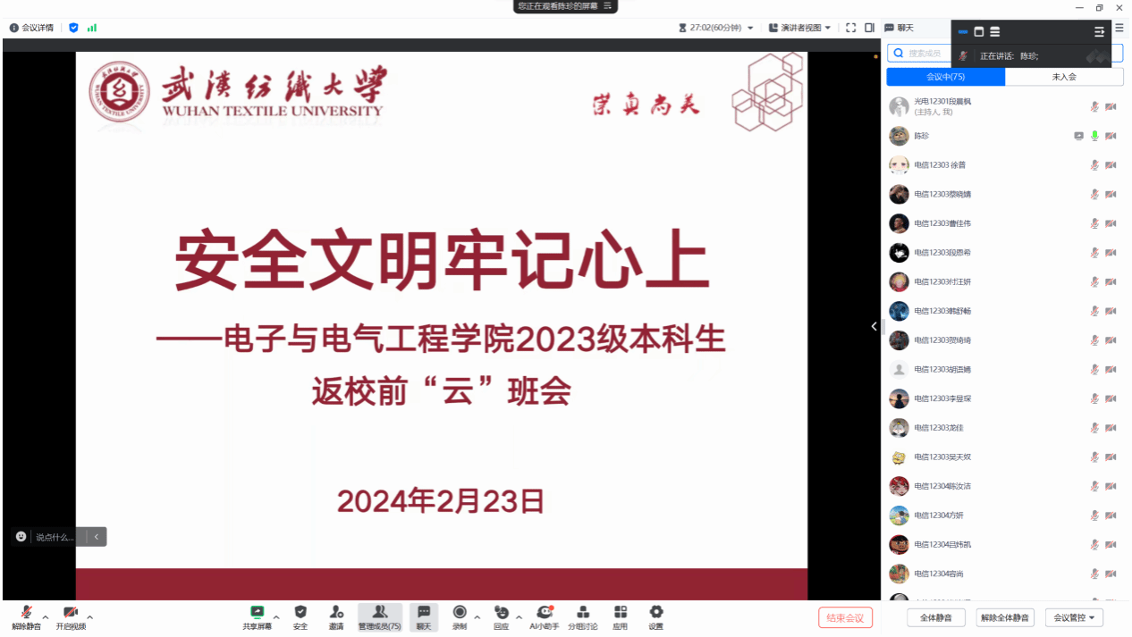 为落实2024年春季学期员工返校工作各项要求,确保员工平稳、有序返校,2月22日-23日,yl7703永利全体辅导员通过腾讯会议、雨课堂等网络平台,组织全体员工召开了主题为“安全文明牢记心上”的返校前“云班会”。