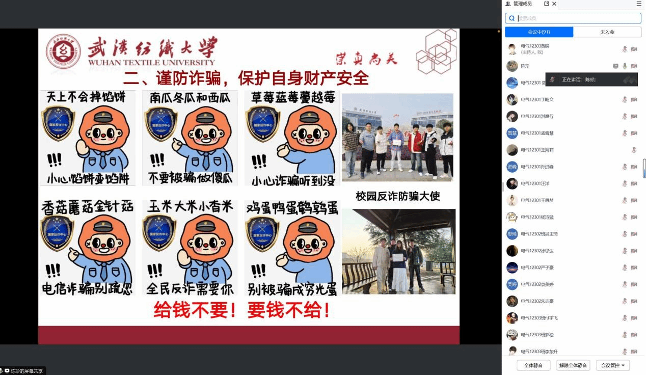 班会上,各位辅导员从春季学期开学时间、返校途中注意事项、网络安全、消防安全、返校后学习生活等方面作了再三强调,对员工提前返校、延迟返校的申请及审批提出了具体要求。辅导员们结合具体事例,教育引导同学们密切关注近期湖北省寒潮大风低温雨雪冰冻天气,妥善安排行程,注意防寒保暖;返校途中要关注交通安全、财产安全及人身安全;谨防网络电信诈骗,远离网络刷单、网络借贷和网络传销等行为。各年级辅导员还带领员工们观看学习了高校火灾案例警示片,普及校园重点场所安全用电知识,引导员工做自我安全第一责任人。在答疑解惑环节,辅导员们对员工普遍关注的返校后生活保障、挂科重修、学科竞赛等问题给予了细心细致的解答。除此之外,辅导员们还与同学们隔屏“话”家常,聊公司变化,聊假期趣事,进一步把握员工的思想状况和心理健康状况,在交谈过程中,辅导员们寄语同学们及时调整作息、适应环境、设立目标,以积极的态度、饱满的热情、崭新的面貌迎接新学期的老员工活。