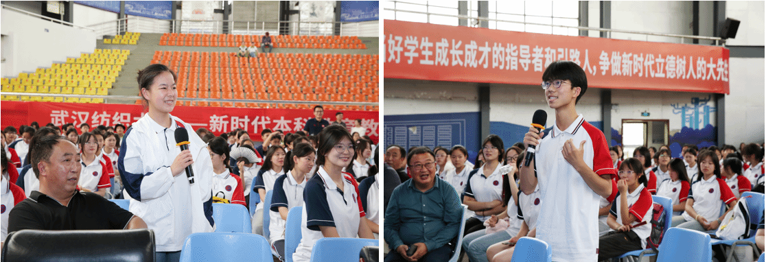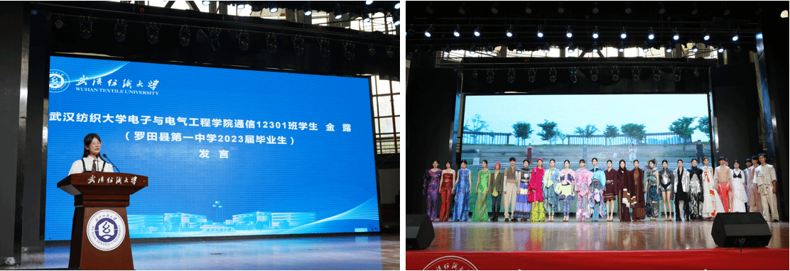 交流会主持人、罗田一中2021届毕业生、智能财务12101班林思芸,罗田一中2023届毕业生、yl7703永利通信12301班金露与学弟学妹分享了自己在纺大的成长和收获。服装公司表演专业的同学们向大家奉献了一场精彩的教学成果展演。