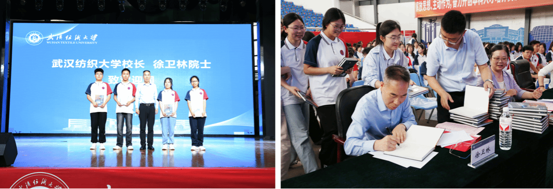 高中学子们见到了亲切的员工、学长、榜样徐卫林院士,迫不及待地进行互动交流,自然形成了一场别开生面的“董事长答疑课”。“研制出月面国旗有什么感受”、“石头是怎么变成纤维的”,面对同学们求知若渴地提问,徐卫林结合自己的成长经历、公司的专业设置、从事的科学研究,通俗易懂地解答了同学们的问题,并向每一位来校的师生赠送了科普书籍《航空航天纺织品探秘》,润物细无声地在他们的心中种下了一颗攀登科学高峰的种子。