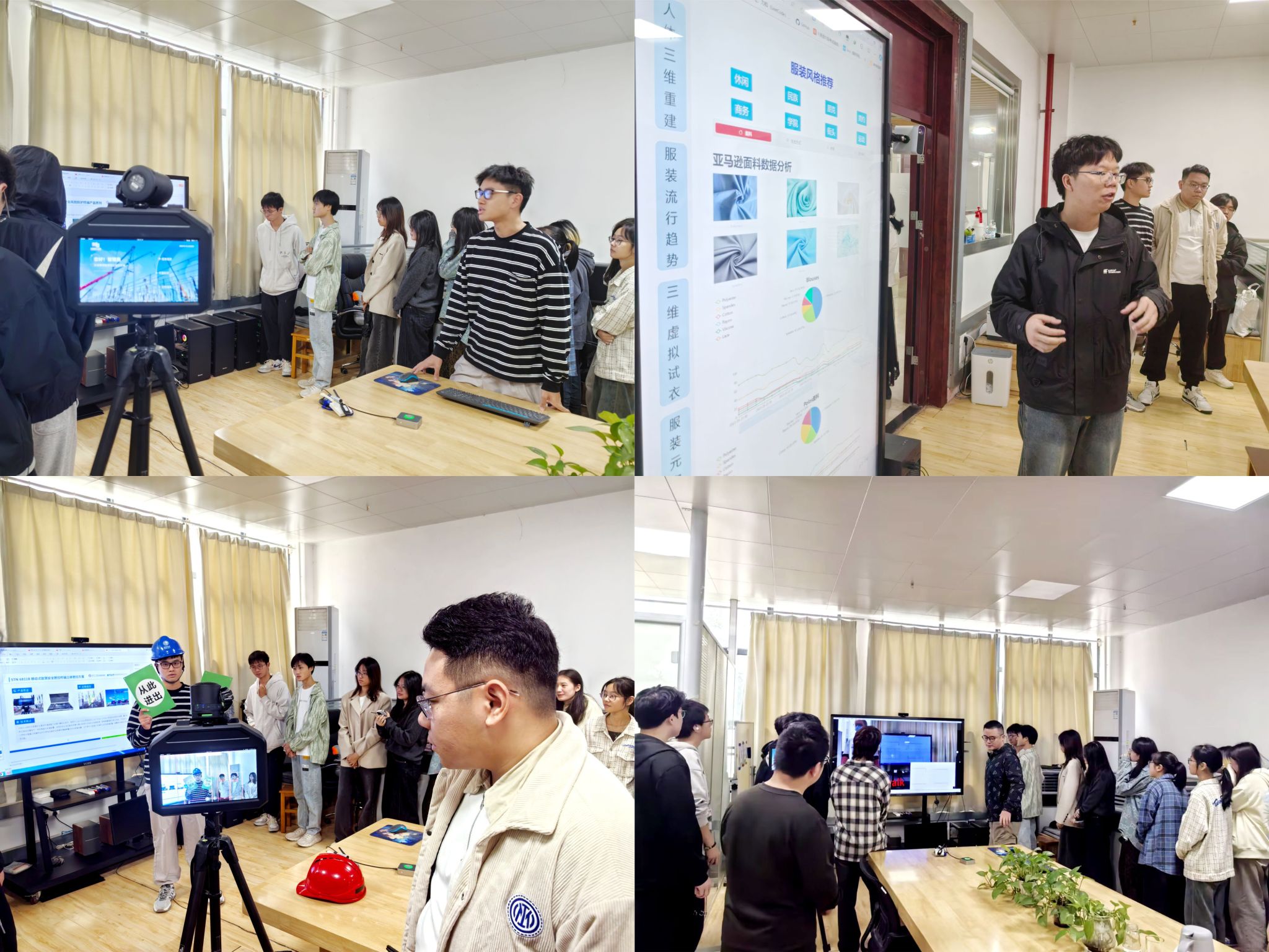 参观学习现场,实验室团队教师刘莉对实验室的基本情况做了详细介绍,团队深耕服装信息化、数字化、以及智能化相关的研究。随后,实验室研究生袁嘉淇、程文韬、余涵臣、李辰晨、饶忠睿、何鉴等6名同学对实验室相关研究工作做介绍和演练。其中,程文韬介绍基于柔性传感信息的人体动作行为识别研究工作,播放了演示视频,同时进行现场讲解;余涵臣介绍了基于多模态信息的智能可穿戴设备研究工作;李辰晨介绍了电力作业场景智能安全监管终端设备(第四代),通过在智能终端中部署轻量化的目标检测与行为识别算法等;饶忠睿介绍了通过EEG (脑电图) 脑电波,结合CVEP (编码调制视觉诱发电位),控制机械臂抓取物体的研究工作;何鉴展示了虚拟试衣镜装置,其中集成了人体三维技术、服装元素流行趋势预测技术、三维虚拟试衣技术等以及相关可视化模块和虚拟试衣模块等;袁嘉淇总结并展示了实验室基于以上研究工作和项目参加的学科竞赛的视频以及获得的成果,同学们产生了浓厚的兴趣。