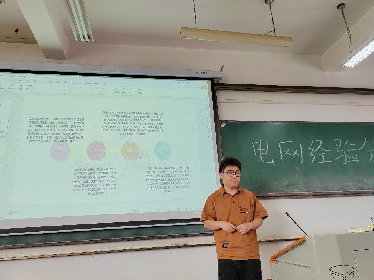 电气12001班贺茂银,电气12002班徐艺慧、丁振,电气12003班路傲翔、戴靖冲五位同学依次上台分享了他们的备考经验。他们分别从了解考试信息、考电网流程、考试报名与复习资料准备、复习计划制定、备考经验与重点难点、考试心态和技巧、国网培训班等多个方面进行了深入浅出的讲解,让在场的同学们受益匪浅。