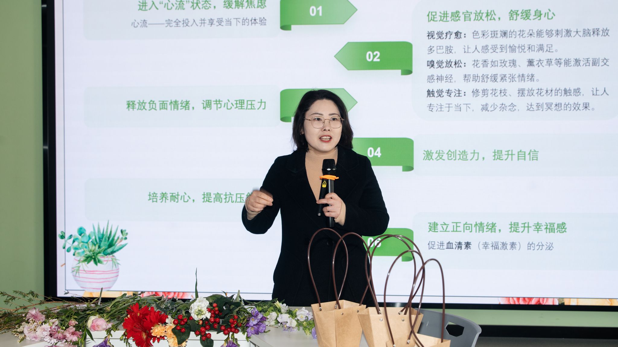 此次团体辅导由心理健康教育中心主任、国家二级心理咨询师江秋玮副教授指导。她从花材的选择、色彩的搭配、花束的制作等多个方面细致讲解了插花的基础知识和技巧,并结合女性多重社会角色特点,从压力管理、情绪调节、身心舒缓等角度引导大家通过花道艺术感悟生命之美、领悟人生智慧。